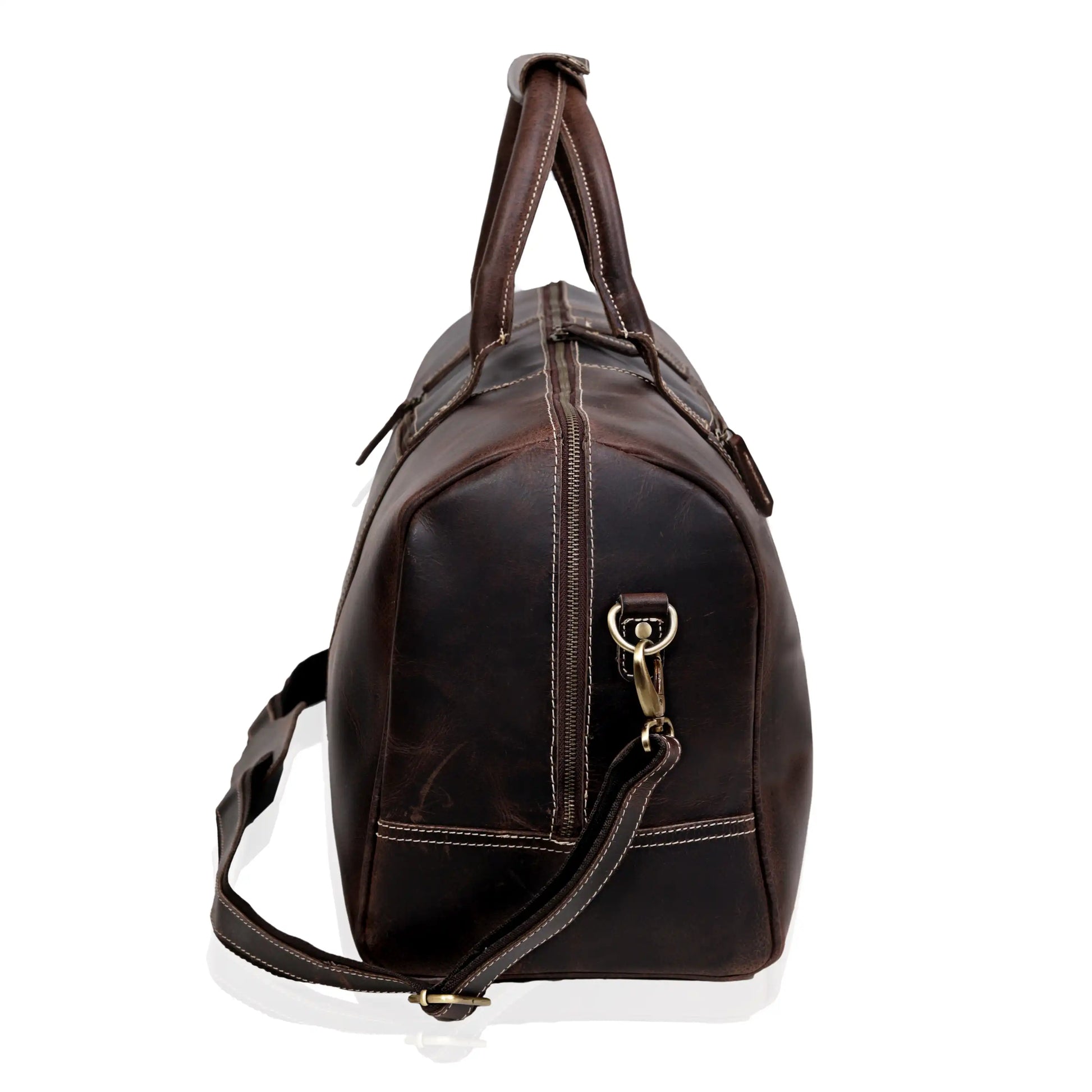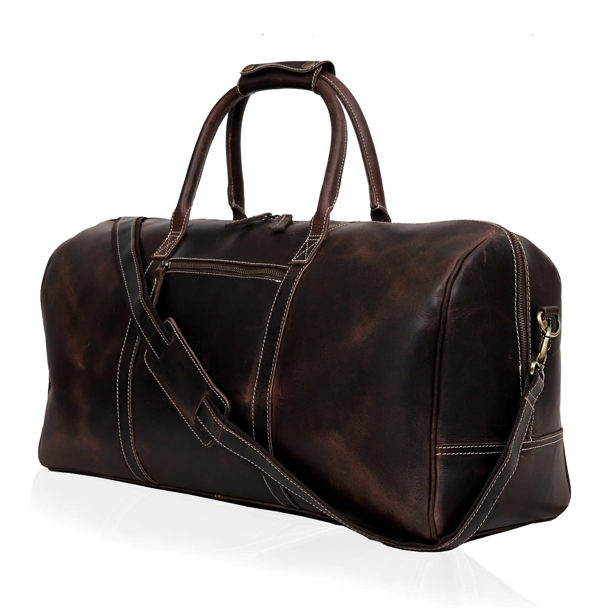 - Tough all-leather carry handle on one end and exterior pockets with buckles