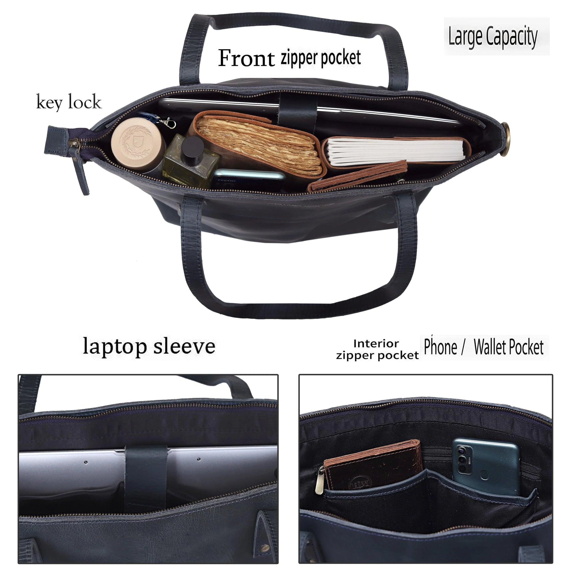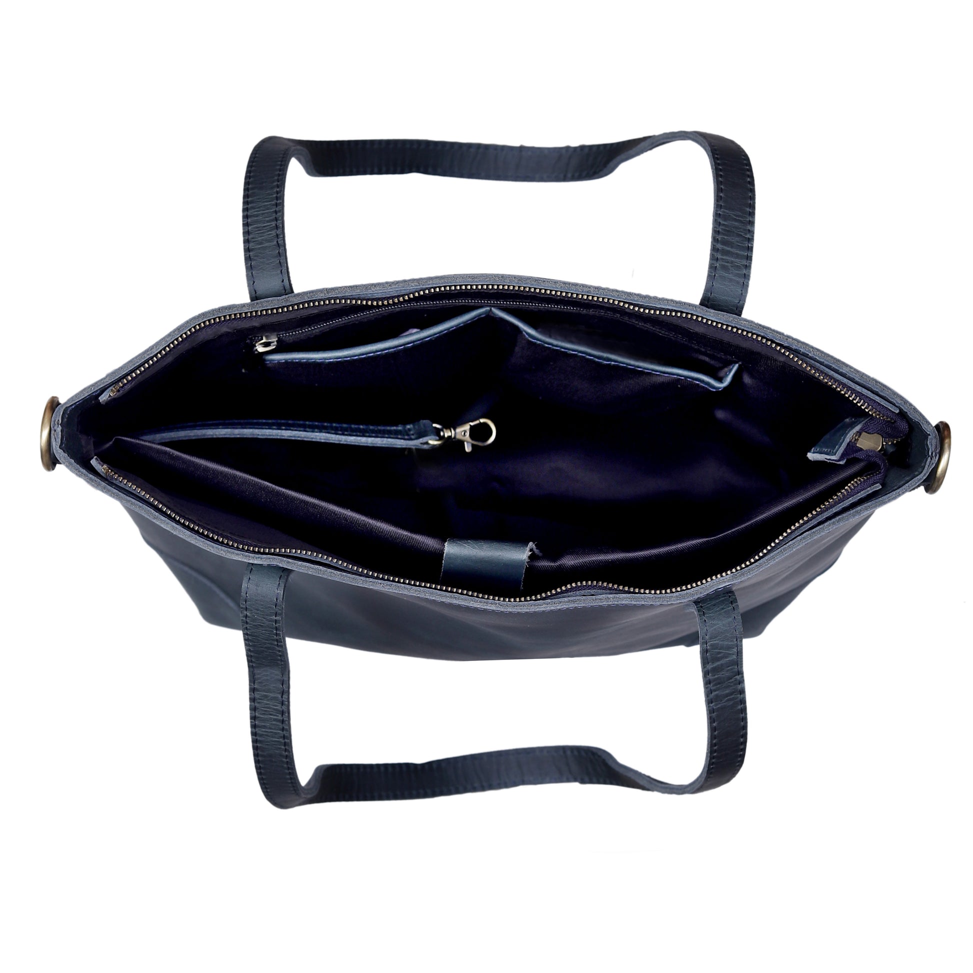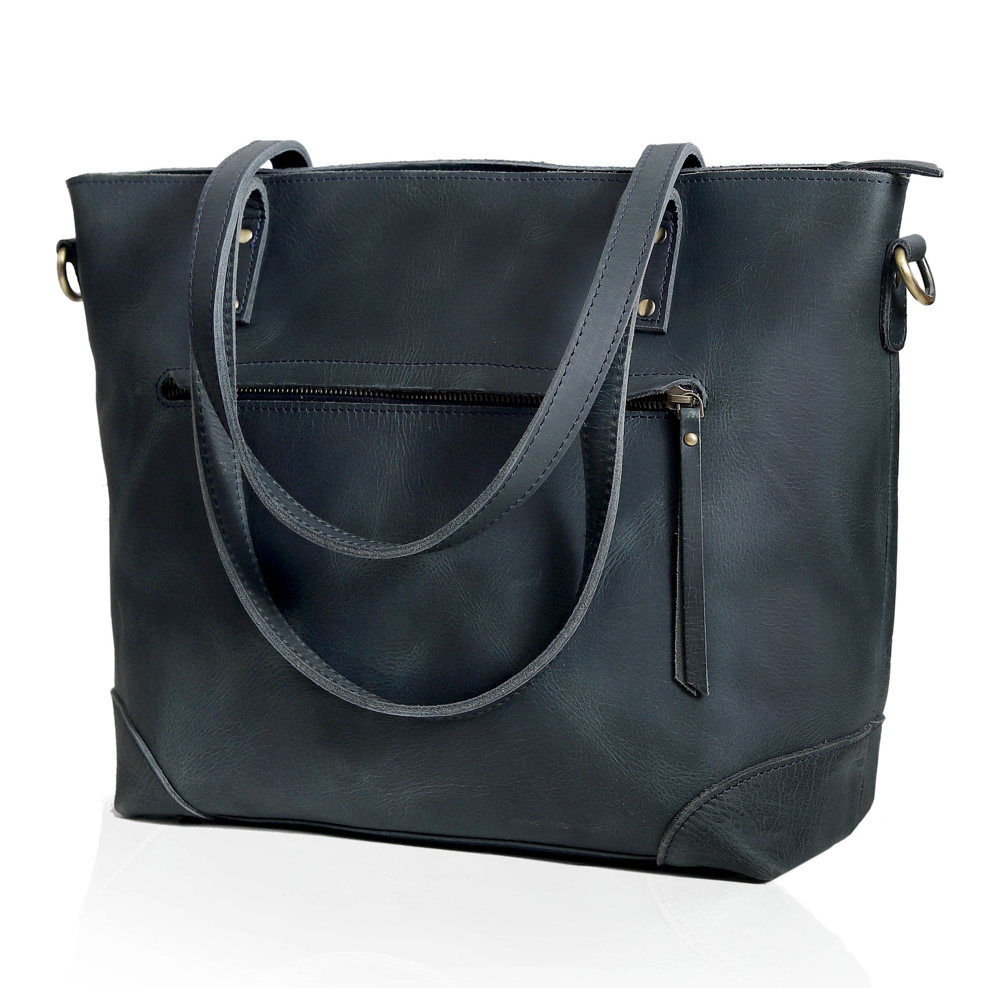 This women's buffalo leather tote bag has a distinctive natural aroma that mellows within days of use. The deep navy tones are achieved through traditional, ensuring each bag has unique color variations and grain patterns.